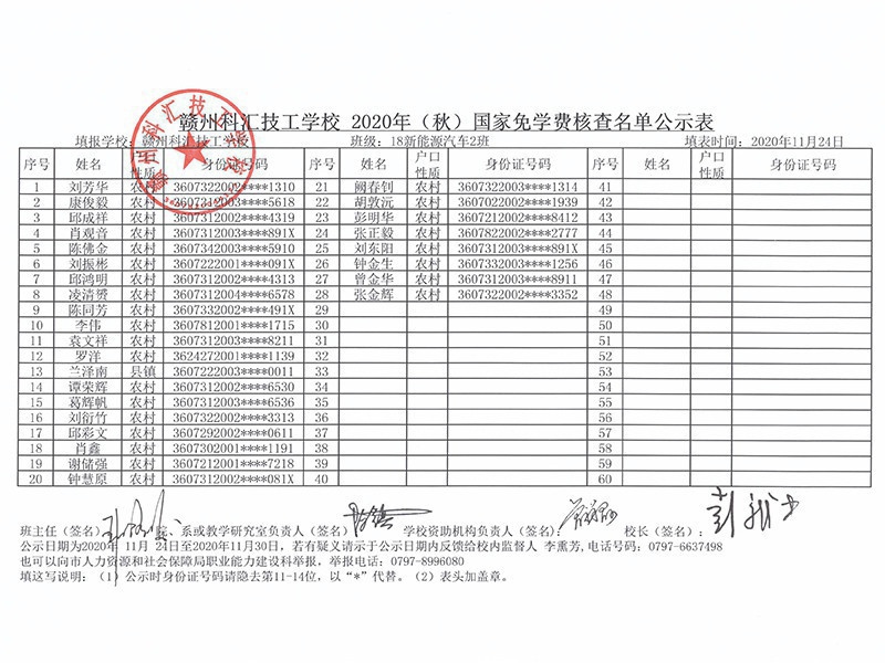 赣州科汇技工学校2020年秋季国家免学费核查名单